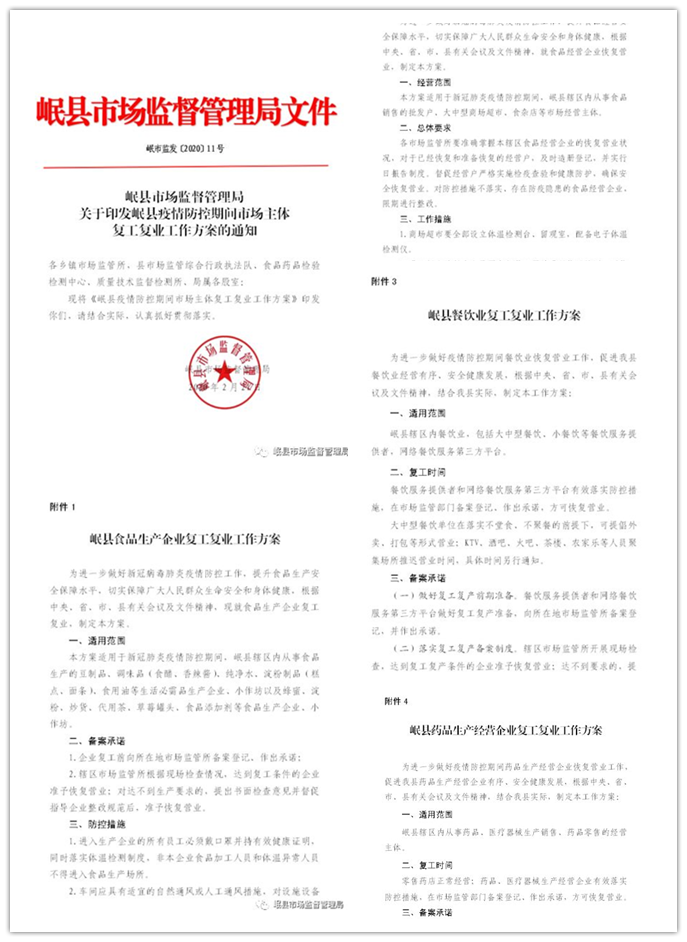 按照党中央、国务院及省市县部署要求,根据定西市新冠肺炎疫情联防联控领导小组办公室相关《通告》规定,县局及时研究,科学施策,坚持属地管理,统筹协调,“谁主管、谁监管,谁审批、谁监管”,“谁用工、谁管理、谁负责”的原则,分领域、分行业制定印发了《岷县疫情防控期间市场主体复工复业工作方案》和《岷县食品生产企业复工复业工作方案》《岷县食品经营企业复工复业工作方案》《岷县药品生产经营企业复工复业工作方案》《岷县餐饮行业复工复业工作方案》等“1+4”工作方案。为市场主体复工复产明确了要求,细化了措施,靠实了责任。并要求药品生产企业、食品生产企业、食品经营企业、大中型餐饮单位健全完善疫情防控方案和应急预案,做到预防为先,有的放矢。