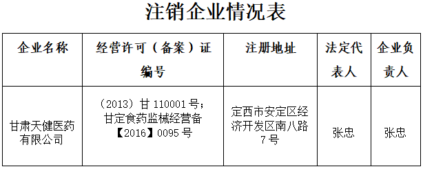 按照《医疗器械监督管理条例》、《医疗器械经营监督管理办法》的规定,根据企业申请,现注销甘肃天健医药有限公司《医疗器械经营许可证》及《第二类医疗器械经营备案凭证》。