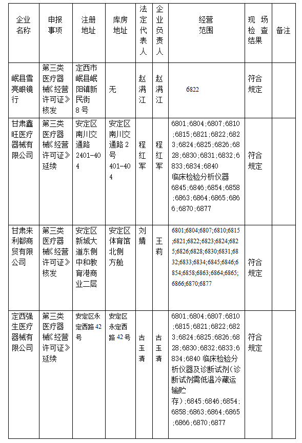 根据企业行政许可事项的申请,依照《医疗器械经营质量管理规范》及《定西市医疗器械零售(批发)企业现场检查实施细则》的规定,对岷县雪亮眼镜行、甘肃鑫旺医疗器械有限公司、甘肃来利都商贸有限公司、定西强生医疗器械有限公司4家公司第三类医疗器械许可申请事项进行了现场检查、行政审核,符合规定,现将现场检查和行政审核结果予以公示,公示期7天,请社会各界予以监督。 监督电话:0932-8215069 通讯地址:定西市安定区西岩路20号 邮编:743000 特此公告 定西市市场监督管理局 2023年8月9日