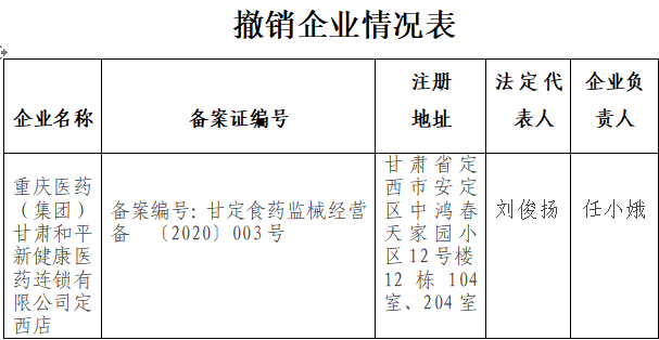 按照《医疗器械监督管理条例》、《医疗器械经营监督管理办法》的规定,根据企业申请,现撤销重庆医药(集团)甘肃和平新健康医药连锁有限公司定西店《第二类医疗器械经营备案凭证》。