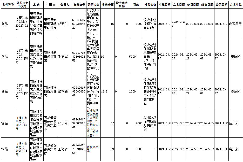 渭源县市场监管行政处罚公开表