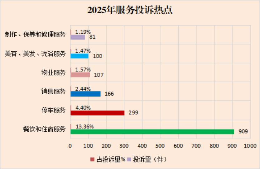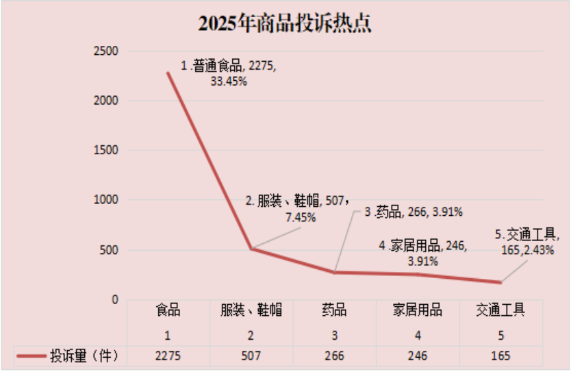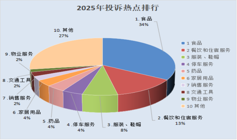 三、2025年投诉热点分析 2025年,全市12315平台受理消费者投诉6802件,其中:食品2275件,占投诉总数的33.45%;餐饮和住宿服务909件,占投诉总数的13.36%;服装、鞋帽507件,占投诉总数的7.45%;停车服务299件,占投诉总数的4.40%;药品266件,占投诉总数的3.91%;家居用品246件,占投诉总数的3.62%;销售服务166件,占投诉总数的2.44%;交通工具165件,占投诉总数的2.43%;物业服务107件,占投诉总数的1.57%;其他方面的投诉1862件,占投诉总数的27.37%。投诉总量较上年度同比上升5.77%,分析原因:一是12315投诉举报程序更加便捷,消费者的诉求渠道更加畅通,通过12315平台进行投诉举报成为消费者维权的主要途径。二是区域经济发展积极向好,投诉举报量增加侧面反映出消费活动活跃,商业交易量增长。三是消费者综合素质提高,维权意识不断增强,遇到消费纠纷进行投诉举报已成为常态。四是全市电子商务发展迅速,电商经营户不断增加,网上交易量逐年增长,受经营者经营水平限制,商品介绍不准确、宣传用语不规范,造成投诉量在一定程度上增加。五是本地一些经营者对初级农产品和土特产商品的标识不规范,没有标明生产日期、保质期、联系电话等信息,引起消费纠纷。六是“职业打假”现象依然突出,牟利性投诉时有发生,相同类型、同一问题的多次、重复投诉量仍在增加。