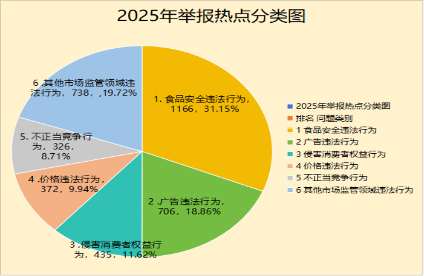 四、投诉热点问题分析 (一)食品安全方面问题居多。通过分析,食品安全问题仍然是消费者投诉的重点领域和主要方面。食品类投诉在商品消费投诉中排在首位,其中包括餐饮食品、酒和饮料、食用农产品等类别。投诉的问题主要集中在食品安全、质量、宣传、包装、标识、售后等方面。普通食品类投诉排名前三的依次是餐饮食品、方便食品、粮食加工品,而酒和饮料类、食用农产品类的投诉也占据了相当大的比例。食品方面投诉问题可归纳为:安全隐患问题,如商家销售临期食品不告知、将临期食品与其他食品混合销售、食品包装不符合规定、食品标签内容不符合相应产品标准规定、食品成分等。食品质量问题,如商家销售的食品变质或食品中有异物,消费者用餐后引发身体或心理不适等。宣传误导问题,如商家故意夸大功效、虚假宣传,以普通食品冒充保健食品,将无“蓝帽子”标识及保健食品批准文号的普通食品伪装成保健食品销售,声称普通食品具有某种保健功能或治疗疾病效果等。外卖食品问题,如反映外卖食品不卫生、封装不严、出现遗洒、送餐不及时、索要好评、发生争议、对服务态度不满等问题,当前外卖食品投诉量增长明显。 (二)家居装修行业问题突出。近年来随着家居装修行业的蓬勃发展,相关领域消费纠纷也大量增加。家装领域消费纠纷普遍存在案件复杂、调解难度大等特点。主要问题是:定制纠纷问题,如反映全屋定制的家具货不对板,家具成品的尺寸、款式、颜色存在与合同约定和设计图不符的情况较为普遍。工期延误问题,反映商家(供货商或装修公司)不按合同约定时间交付家具产品、不按约定时间施工的问题经常出现。材料质量问题,反映商家以次充好、以普通材料冒充环保材料、以低价商品替代高价商品销售的情况时有发生。卖场责任问题,反映卖场推诿其责任义务,在出现卖场内商家无法履行合同后,卖场会利用各种理由借口,拒绝承担场地出租者义务,推诿排除自身法定责任的问题逐渐增多。 (三)网络交易投诉逐年增加。伴随网络交易多样化带来的便利,线上消费产生的投诉数量逐年增加。2025年全市12315平台共受理网络交易投诉举报共3491件,占全年投诉举报总量的33.1%。网络交易投诉主要集中在普通食品、食用农产品、中药材、土特产等领域。主要问题是:虚假宣传问题,如反映商家对出售的商品作出定论性宣传、对产品性能进行夸大而不符合实际的宣传、宣称“首创”“独家经营”等排他性宣传、冒用他人名义或商誉的宣传等。违法广告问题,如反映商家的网店宣传页面出现夸大质量性能的欺骗性商品介绍、未经审核进行广告宣传、广告中含有“国家象征”标志等违禁内容、使用“国家级”“最高级”“最佳”“纯天然”“纯手工”“100%”等绝对化用语进行广告宣传等。商品质量问题,如网售商品损坏、瑕疵、与商品介绍不一致,商家销售假冒伪劣产品或产品性能与描述不符,低价销售过时或过季的商品而实际使用价值不高,商家通过虚假促销活动吸引消费者但实际商品质量无法保证等。直播销售问题,如商品所见仅是图片,经营资质、商品来源、商品质量、售后服务无法保证,消费产生争议后无法落实卖家详细经营地址,特别是网红造势、低价引流,虚假宣传、误导消费的情况比较突出。 (四)牟利性投诉问题居高不下。一些“职业打假人”刻意消费、目的索赔的投诉依然较多,问题十分突出。主要表现为:数量急剧增长的问题,一些商家在面对“职业打假人”的索赔要求甚至要挟和勒索后,没有通过法律手段维护正当权益,而是采取赔偿等“私了”方式进行妥协,一定程度上助长了牟利性投诉人气焰,相应产生了大量重复投诉行为。解决困难的问题,职业打假索赔人滥用权利,通过反复投诉、行政复议、行政诉讼等手段,向监管部门施压,将索赔目的传导给商家,以满足其索赔要求,受理单位处置解决费人费时,困难很大。倾向性强的问题,“职业打假人”大多针对虚假宣传广告、食品标签标识、产品包装及标准适用等问题进行投诉,而很少有反映与广大群众人身财产安全相关的问题,其一旦获得利益后,往往就会撤诉。负面影响的问题,牟利性投诉违背了社会公平正义,影响了社会诚信环境和营商环境。大部分投诉问题并没有造成社会危害和影响,牟利性投诉索赔行为恶性循环,严重影响了维权效能。 五、2025年举报热点及问题分析 2025年全市共受理举报3743件。按举报量看:食品安全违法行为1166件、占比31.15%;广告违法行为706件、占比18.86%;侵害消费者权益行为435件、占比11.62%;价格违法行为372件、占比9.94%;不正当竞争行为326件、占比8.71%;其他违法行为738件、占比19.72%。