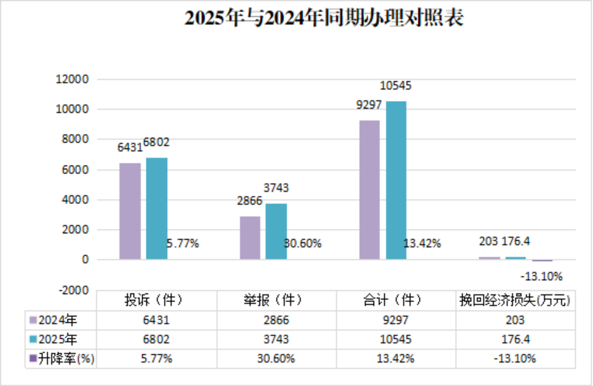 一、总体情况 2025年,定西市12315中心接到消费者投诉、举报共10545件,其中投诉6802件,举报3743件,为消费者挽回经济损失176.4万元。投诉、举报总数较上年度增长13.42%,挽回经济损失金额下降13.1%。